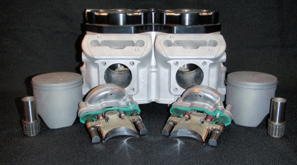Send in your cylinder and exhaust valves complete, We bore out your cylinder, weld for port shapes an strength, fully port it for proper velicty and airflow (not just raising the sub ports), Nikasil'd, comes with stock cast reliable pistons, Terra Alps billet head set up for pump gas at your riding area, exhaust Valve modification, proper clearances and nikasil.