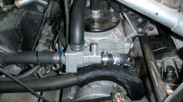 Thermostat kit for 2008-2015 Polaris snowmobiles and other years. Keeps sleds running cooler makes more HP! larger thermostat flows more coolant then stock thermostat keeping engine temperatures more consistant, less chance of overheating, has built in bypass so no cold shocks, removes poor stock thermostat. Billet housing, thermostat, bypass hose and tee.